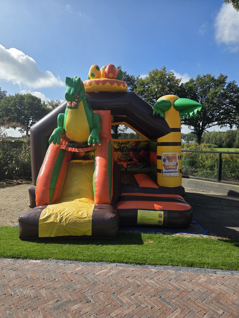 Beleef urenlang speelplezier op een van onze populairste springkussens. De Slide Combo Dino is een vierkant springkussen welke aan een zijde een ingang heeft en naast de ingang een glijbaan. Het springkussen is aan drie zijdes dicht en is overdekt.